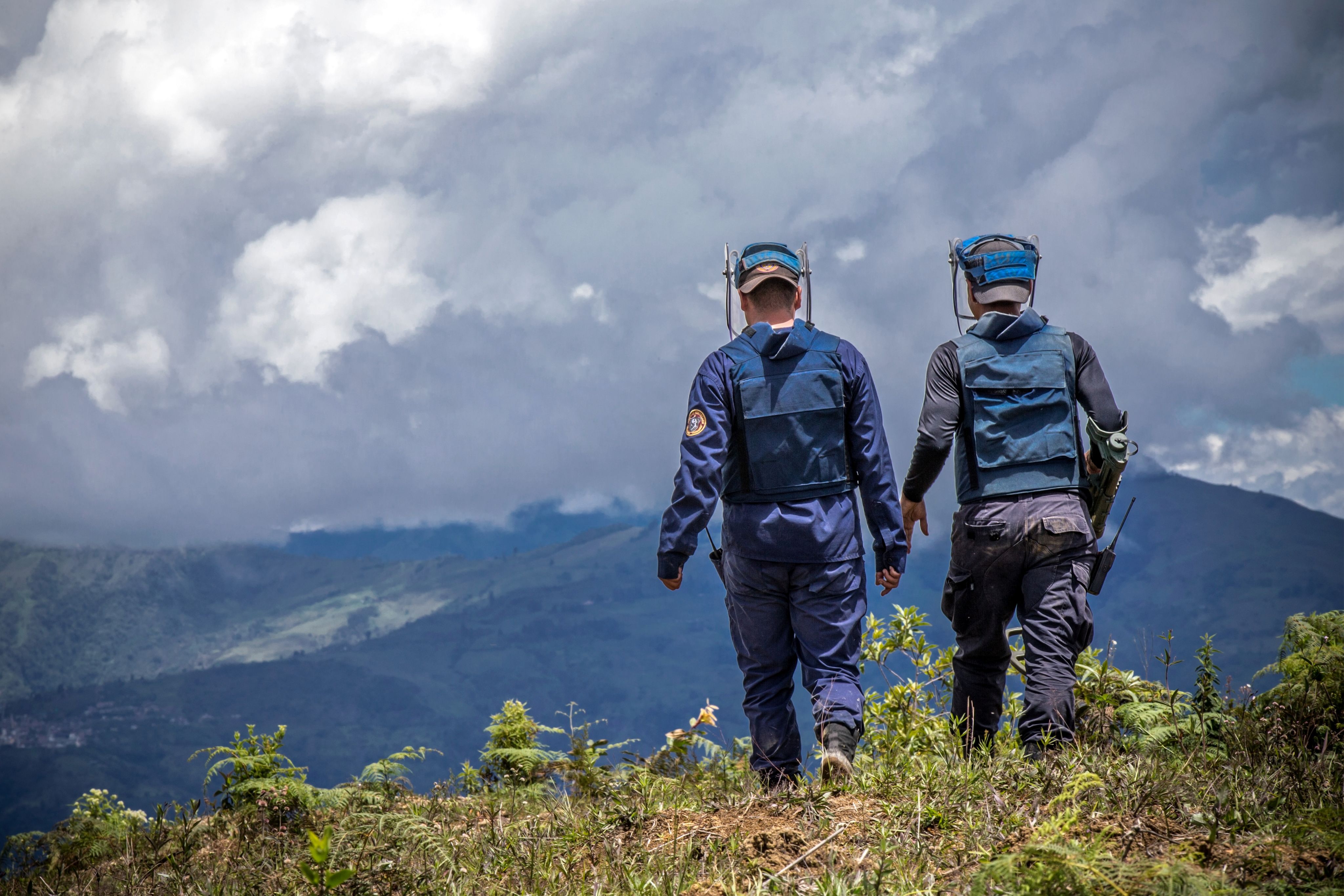 Two members of Colombia's Humanitarian Demining Battalion walk through an area cleared of landmines, in Alto Capitan. Department of Antioquia.