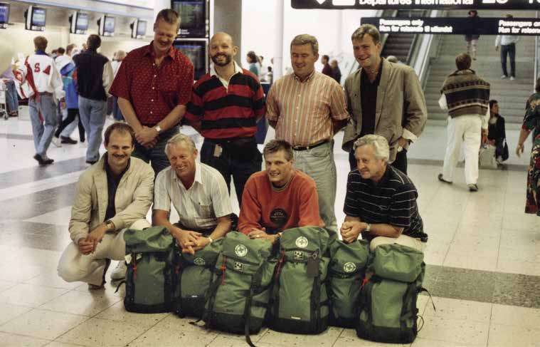 Pioneers: The first group of deminers are ready for departure from Gardermoen airport to Cambodia. From top left: Roger (surname unknown), Tore Skedsmo, Sverre Bae, Are Hemmingsen. From bottom left: Remy Wick, Alf Bjarkøy, Haavard Bach, Henning Rabben. Photo: Unknown.