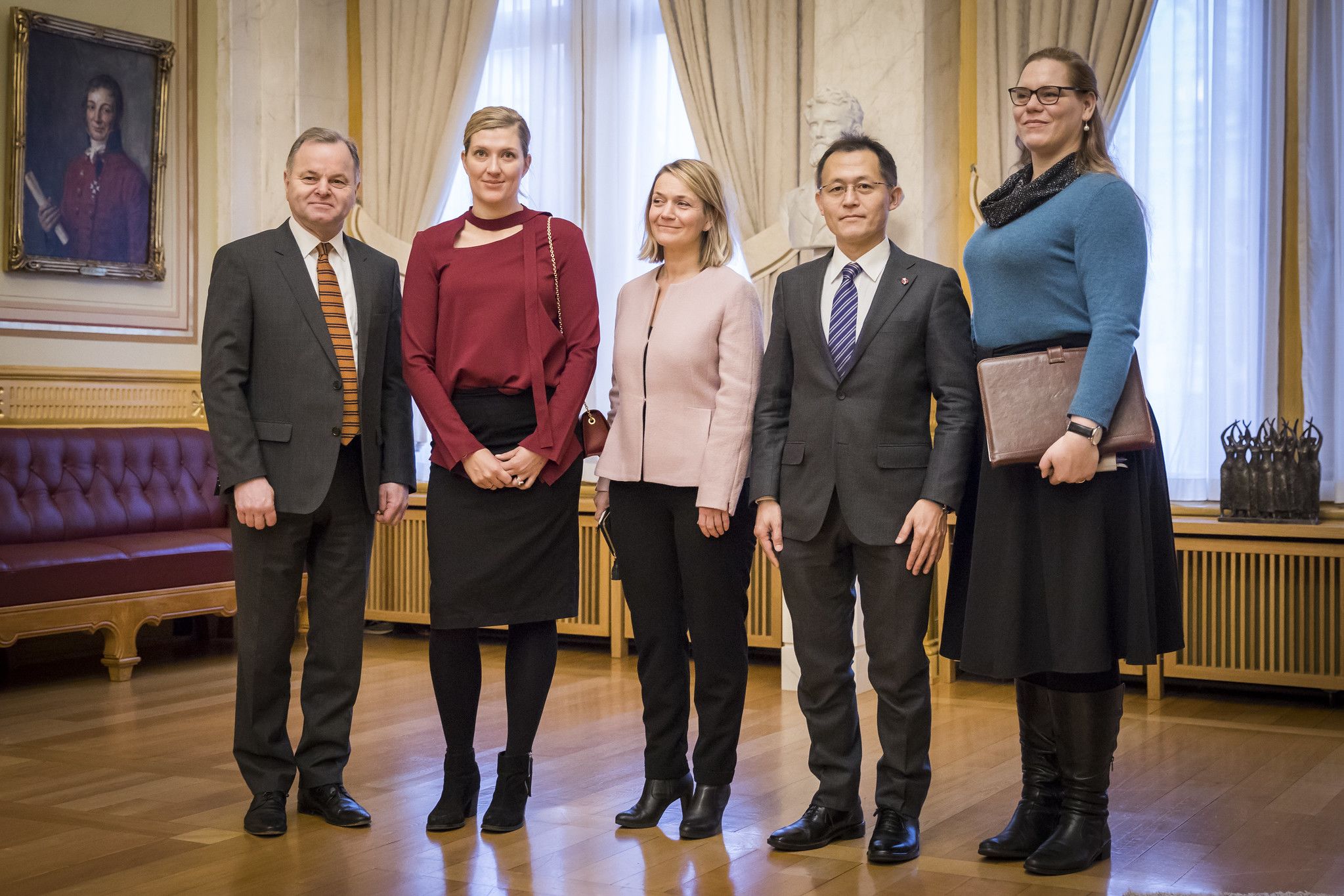 ICAN greets the then President of the Norwegian Parliament, Olemic Thommessen while in Oslo for the The Nobel Prize award ceremony. From left: executive director Beatrice Fihn, NPA's Grethe Østern, Akira Kawasaki and Susi Snyder. Photo: Stortinget.