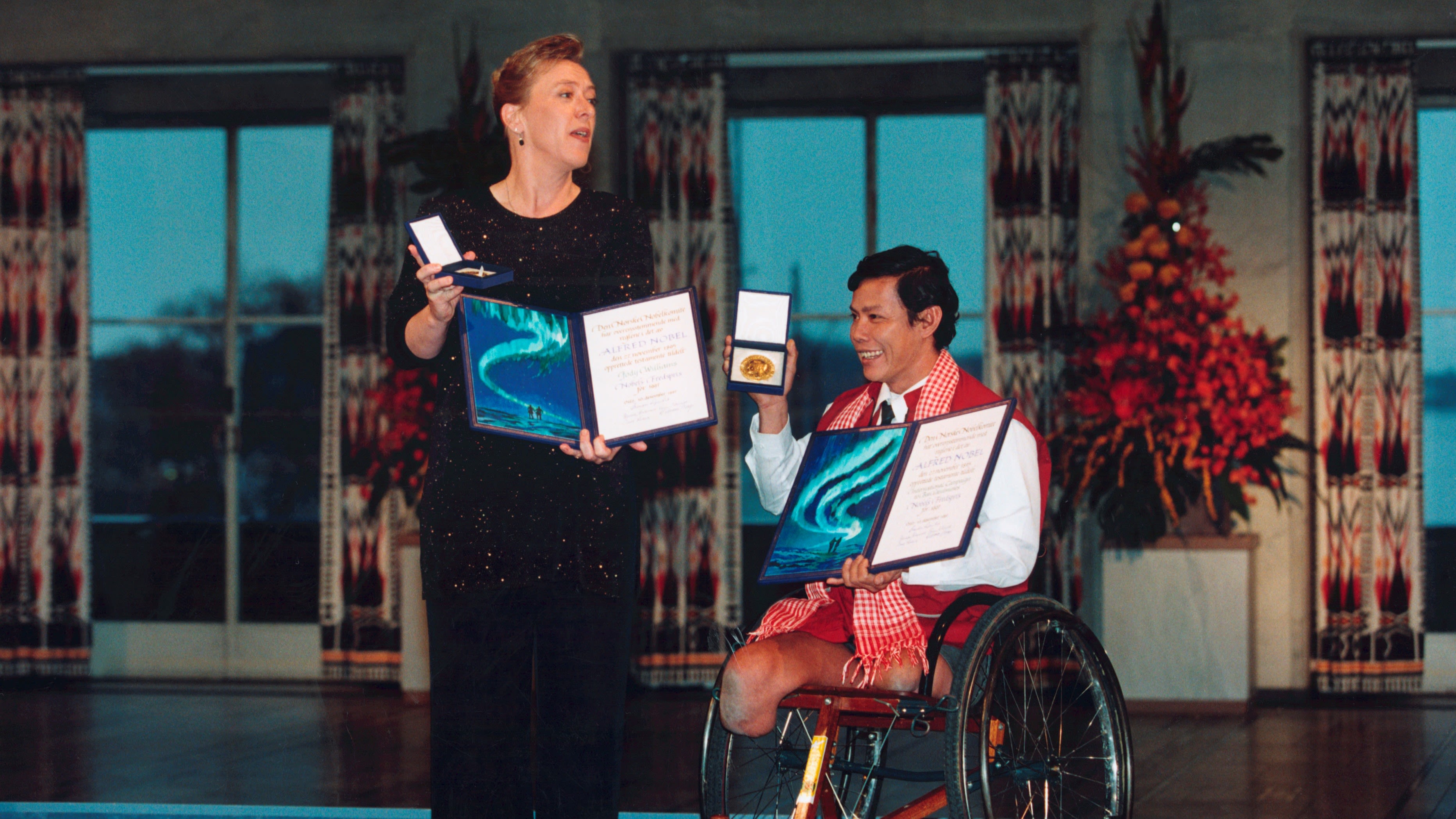 ICBL's founding coordinator Jody Williams and Tun Channarit receive the Nobel Peace Prize for their efforts to ban anti-personnel landmines in Oslo, 1997. Tun Channarit from Cambodia lost both legs in a mine accident in 1982.